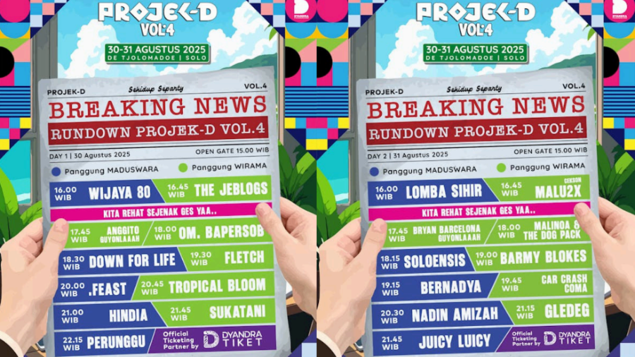 Rundown 20 musisi yang akan tampil di Projek-D Vol.4, di De Tjolomadoe, Karanganyar, 30-31 Agustus 2025.