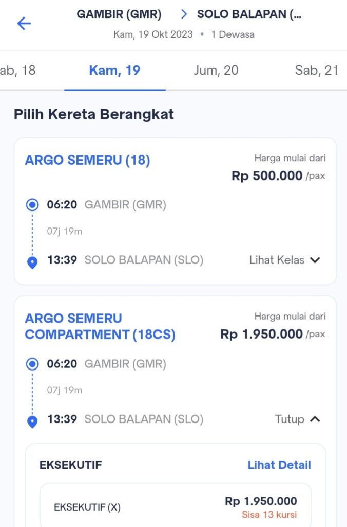 Kamu sudah bisa beli tiket kereta Compartment Suites di tiket.com maupun Acces by KAI dengan harga Rp1.950.000 per pax. Solokini membuka Acces by KAI untuk pesan tiket pemberangkatan acak, ternyata masih seharga Rp1.950.000. Harga yang sama untuk Gambir-Gubeng.