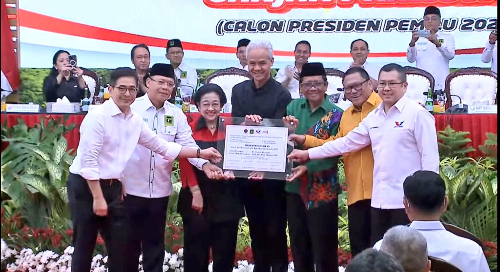 Megawati didampingi para ketua umum partai koalisi pro Ganjar, yakni Plt Ketum PPP Mardiono, Ketum Perindo Hary Tanoesoedibjo, Ketum Hanura Oesman Sapta Odang (OSO). Baik Ganjar dan Mahfud juga hadir dalam pengumuman ini.