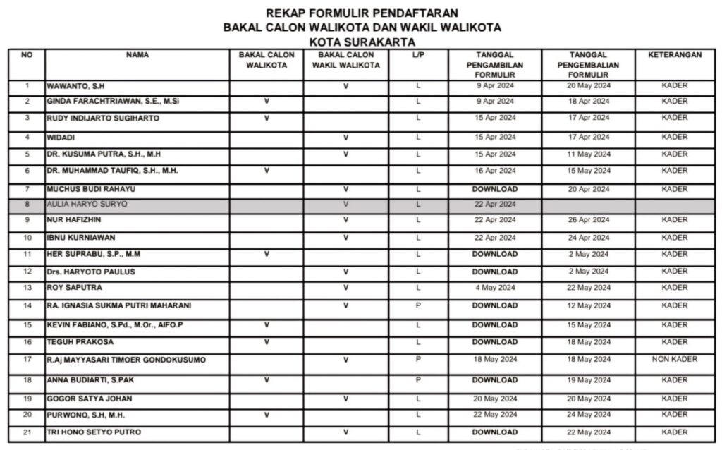 SOLOKINI-DPC PDI Perjuangan Kota Surakarta telah menyelesaikan proses penjaringan bakal calon untuk Pemilihan Kepala Daerah (Pilkada) 2024. Proses yang berlangsung dari 8 April hingga 24 Mei 2024 ini menghasilkan 20 pendaftar resmi, terdiri dari 8 bakal calon walikota dan 12 bakal calon wakil walikota. Dari jumlah tersebut, 19 adalah kader PDI Perjuangan dan satu non-kader.