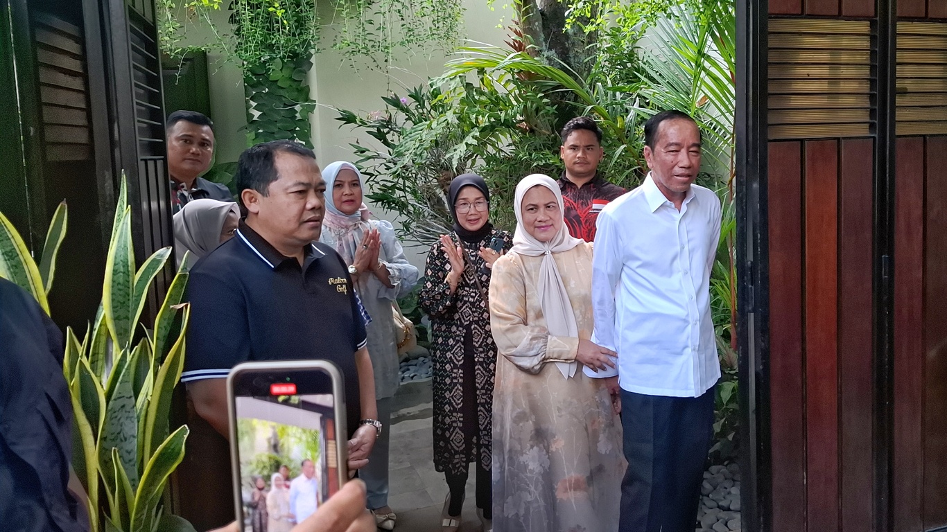Sekitar pukul 11.15 WIB, Jokowi keluar dari dalam rumah ditemani sang istri, Iriana Jokowi, serta adik-adiknya. Ia berdiri di depan pintu gerbang rumah sambil menyapa para tamu.