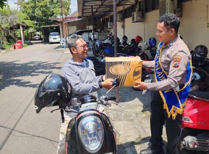 Solokini.com, Sukoharjo – Satuan Lalu Lintas (Satlantas) Polres Sukoharjo memberikan apresiasi berupa pembagian helm Standar Nasional Indonesia (SNI) gratis kepada wajib pajak yang menuntaskan proses balik nama kendaraan di kantor Urusan Buku Pemilik Kendaraan Bermotor (BPKB) Satlantas Polres Sukoharjo.